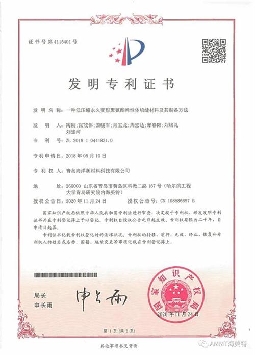 2020年11月24日,青島海洋新材料科技有限公司申請(qǐng)的《一種低壓縮永久變形聚氨酯彈性體填縫材料及其制備方法》發(fā)明專利獲得國(guó)家知識(shí)產(chǎn)權(quán)局授權(quán)。目前,公司共獲得國(guó)家授權(quán)專利32項(xiàng),其中發(fā)明專利29項(xiàng),實(shí)用新型專利2項(xiàng),外觀設(shè)計(jì)專利1項(xiàng)。