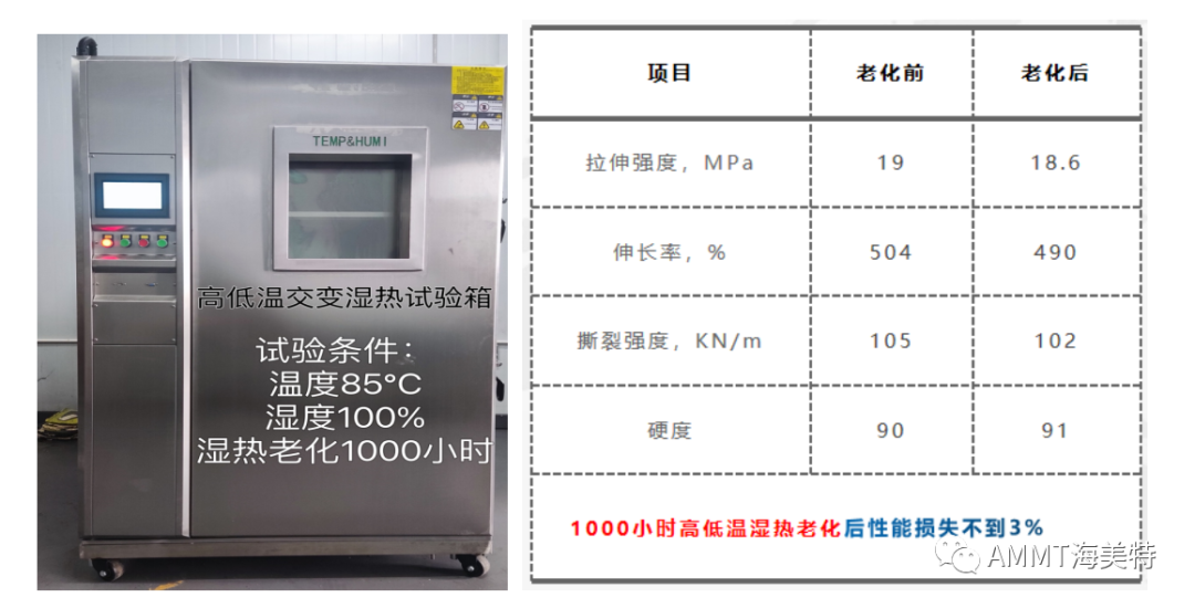 拉伸強(qiáng)度>20Mpa、伸長率>400%,撕裂強(qiáng)度>110KN/m,